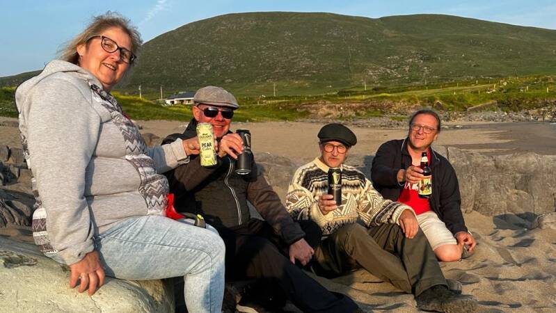 Ireland im Juni 2023: Leider ohne unseren Jungspund Ramon, aber mit Wädi's Lebenspartnerin Denise. Und wir trafen uns mit Frank Zagel (im Bild ganz rechts). Hier, auf Valentia Island (Bild links) und an der Saint Finian's Bay, entstanden erste Sequenzen zu unserem Video "The Dream"....